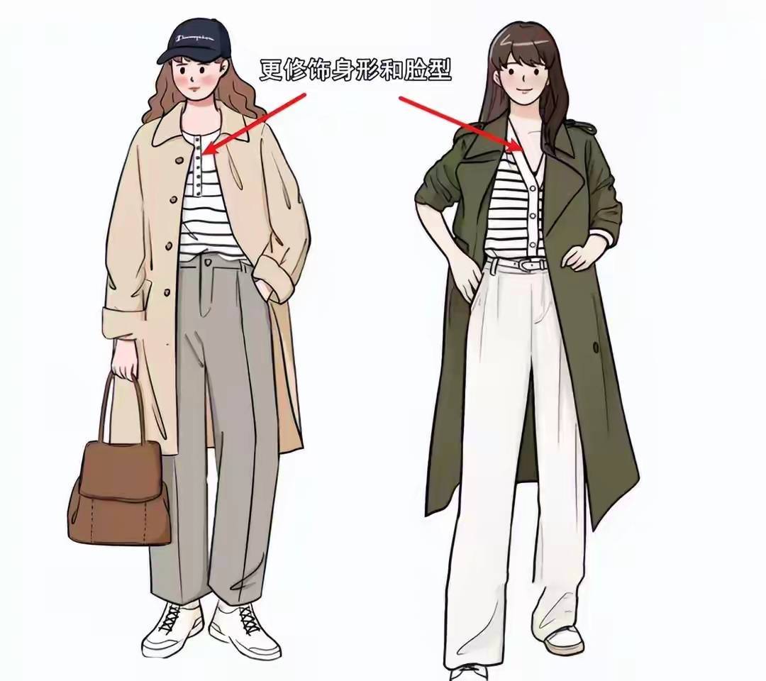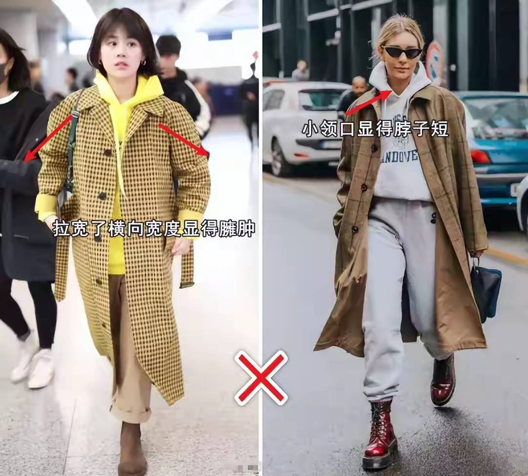 风衣外套如果设计版型不够简约,不够精致,穿在身上之后就会显得上半身很壮实,例如下面左边的这一件风衣,后面加了一个斗篷,就会显得背比较厚。