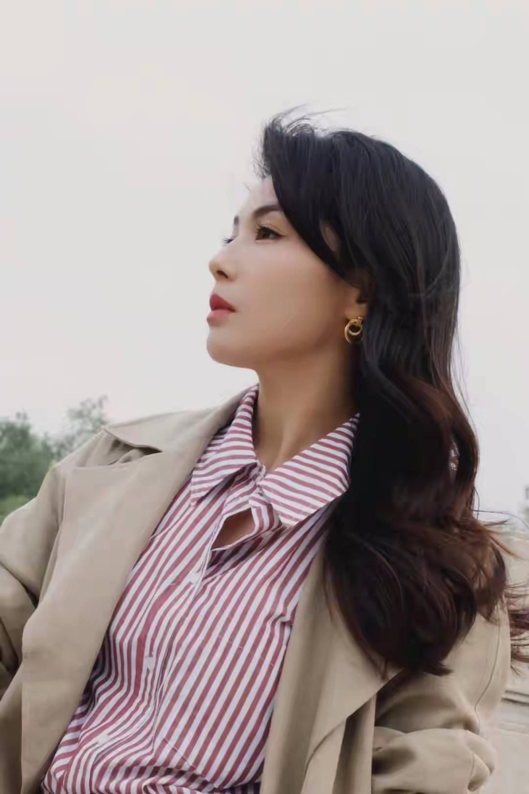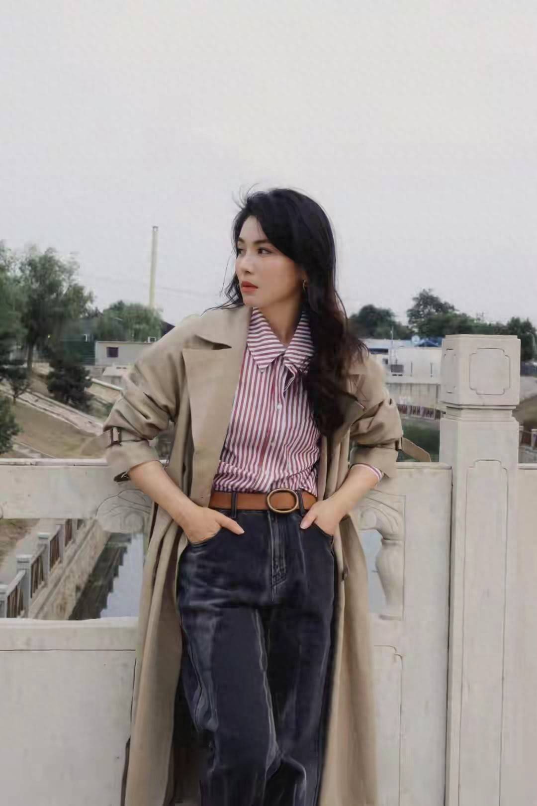 已经是奔五年龄的刘涛,看起来依然年轻貌美,身材高挑纤瘦,不得不说,保养的是真的好,而且穿衣打扮也很大气,用最为经典的卡其色翻领风衣来穿搭,自然很容易提升气质,为了能增加造型的时尚感,里面的内搭直接选择条纹衬衫,这样的衬衫也很符合现在的秋季。