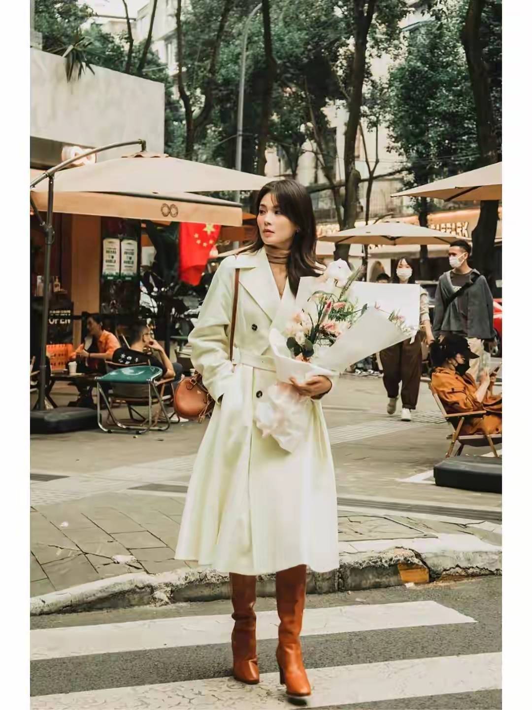 正常情况下来说,像下面这种白色的风衣外套其实不太推荐,普通大众女性借鉴,首先不耐脏,其次,穿在身上并没有像卡其色或者是驼色的风衣那么的经典,当然啦,如果想要尝试不同的衣服颜色,也可以选择像刘涛一样的白色风衣搭配上美拉德色系的皮质中筒靴,也显得又飒又美。