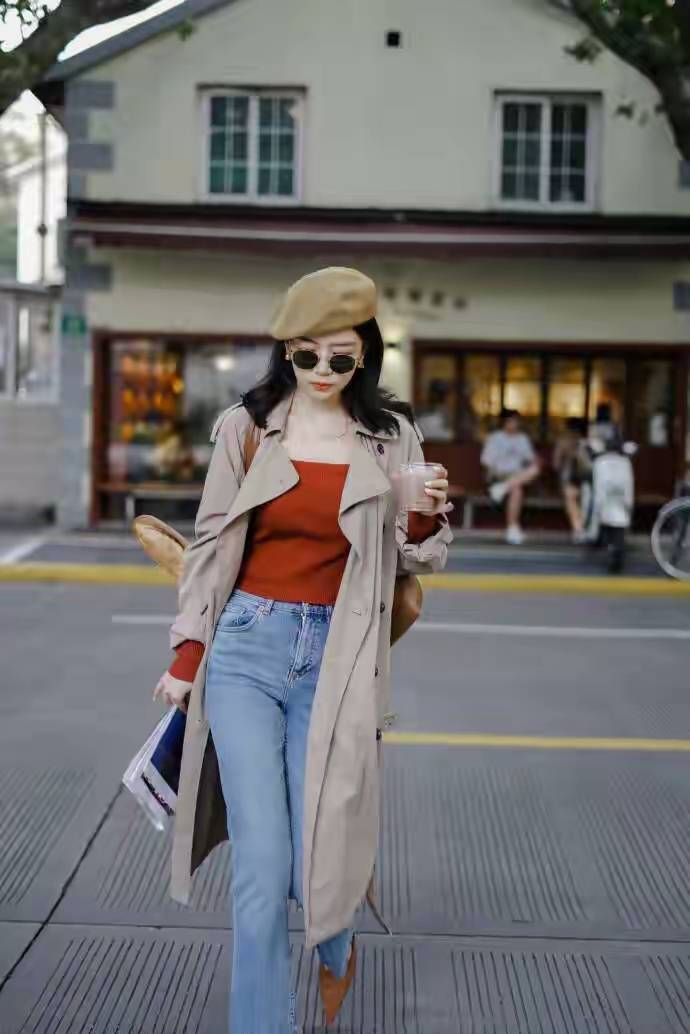 不过不太推荐选择上面这种比较沉闷的色彩搭配,应该选择卡其色的风衣外套,内搭美拉德色系的针织衣服单品,形成一个撞色的效果,层次感更分明,加上天生就拥有时尚元素的牛仔裤脚,穿棕色的高跟鞋,头上戴了一顶贝雷帽,再加上一款墨镜,就能让穿搭者变得又飒又美,通勤又时髦,下面这样的穿搭,不管是去上班,逛街,约会都没有任何问题。