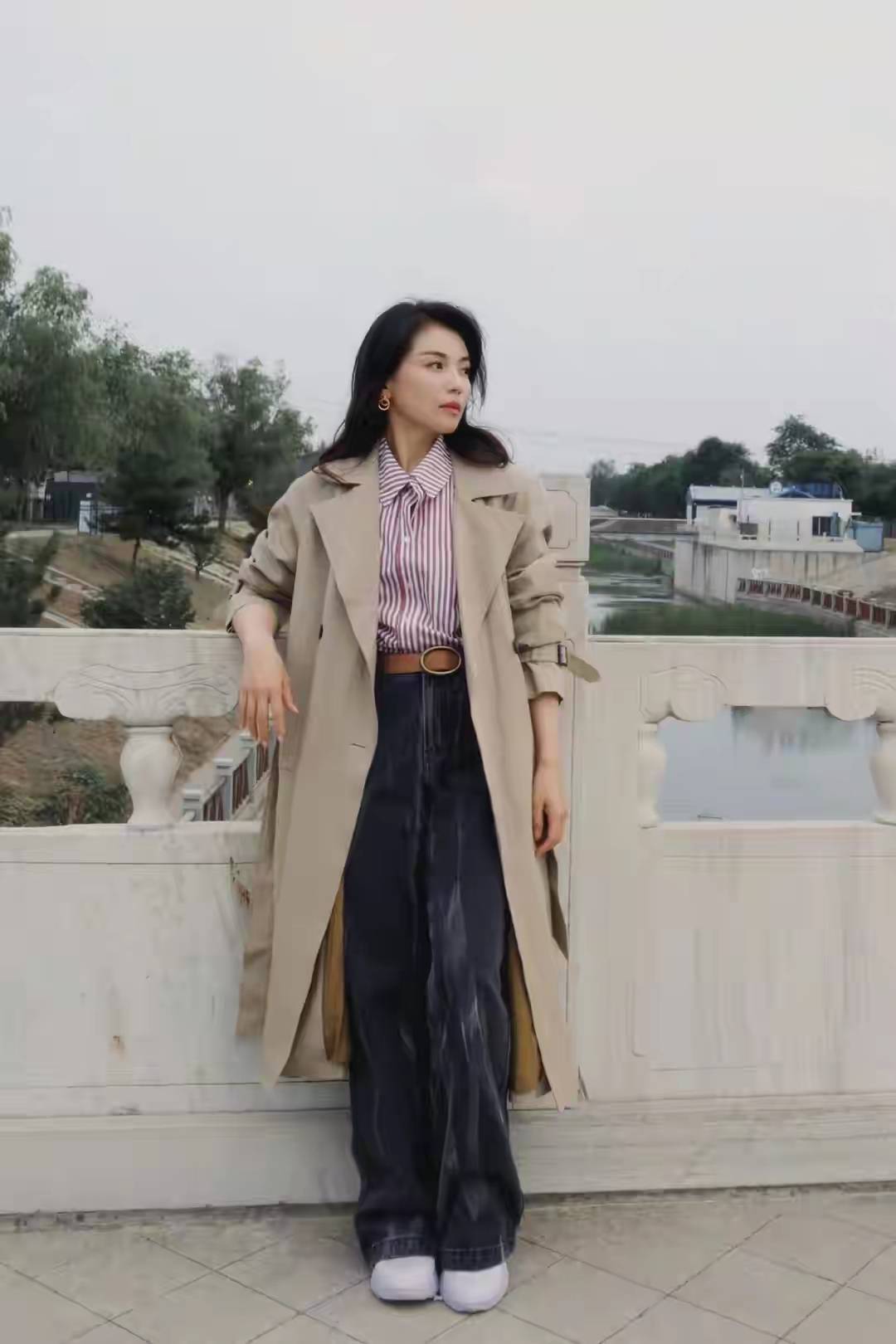 用一件卡其色的长款风衣外套,内搭条纹衬衫,加上灰色的牛仔阔腿裤,脚上穿了一双小白鞋,显得简约大方。