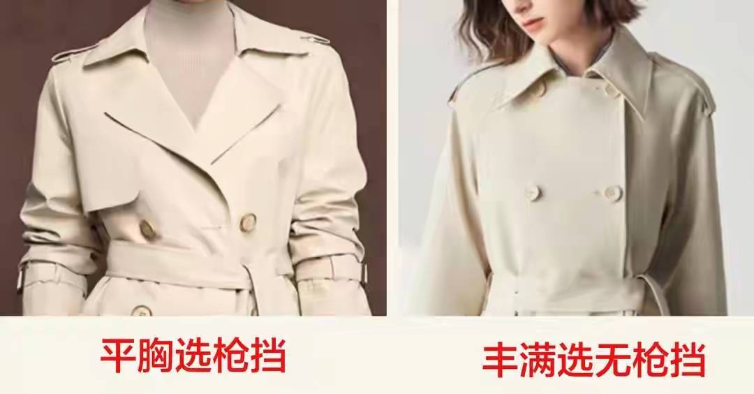 同时,我们在选择风衣细节上也要根据自己的身材来决定,比如说你是平胸的,这时候应该选枪挡的风衣,如果你的身材是比较丰满的情况下,我们可以直接选那种无枪挡的款式风衣。