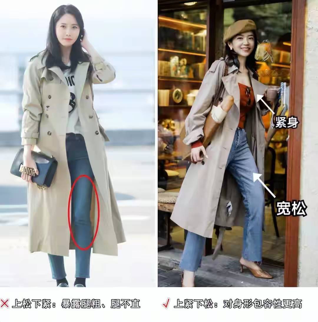 而尽量做到穿松不穿紧或者是松紧结合,咱们普通大众女性身材比例肯定是没法和模特或者是女明星媲美,可能腿型没有那么笔直,这个时候你还选择了紧身的牛仔裤来穿搭,毫无疑问会容易暴露腿粗的缺陷。
